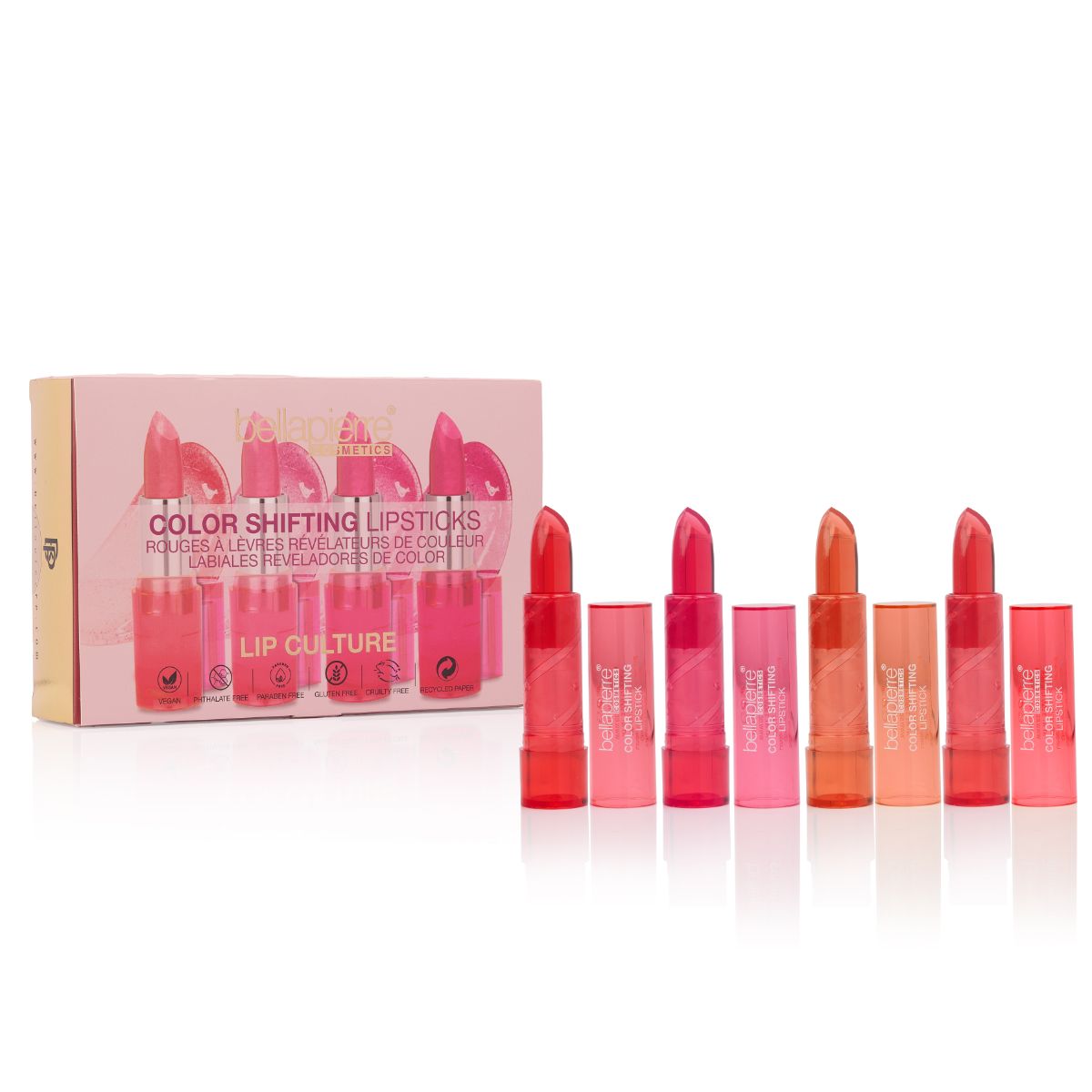 Descoperă Color Shifting Lipsticks Set un ruj care își schimbă culoarea și care se adaptează perfect ție. Acest ruj hidratant cu tehnologie de schimbare a culorii de la Bellapierre reacționează la chimia naturală a pielii tale pentru a crea o nuanță unică, perfect armonizată cu tonul buzelor.